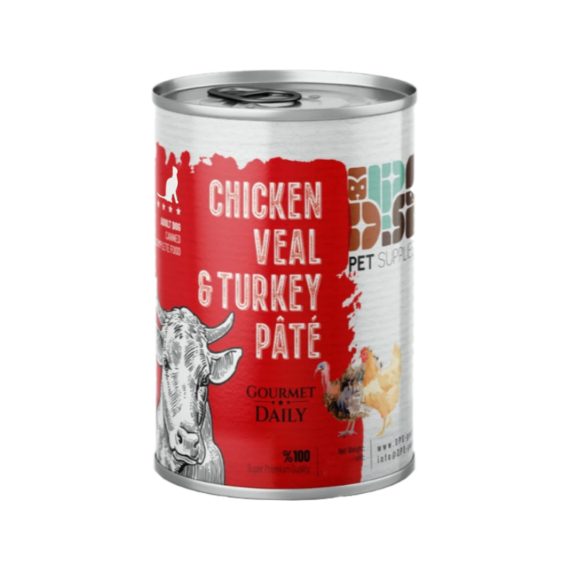 دی پی اس کنسرو گوشت گوساله و بوقلمون و مرغ گربه بالغ 400 گرم